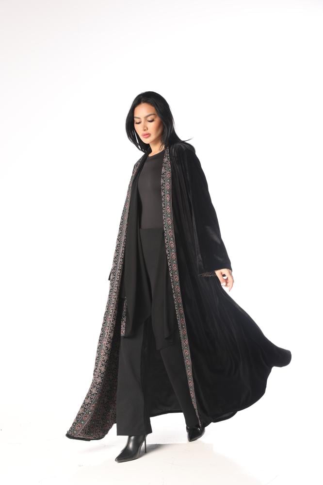التفاصيل: مخمل اسود مع قماش كشمير في الأكمام وأمام العباية من الداخل، القصه كلوش، طرحة بطرف كامل
